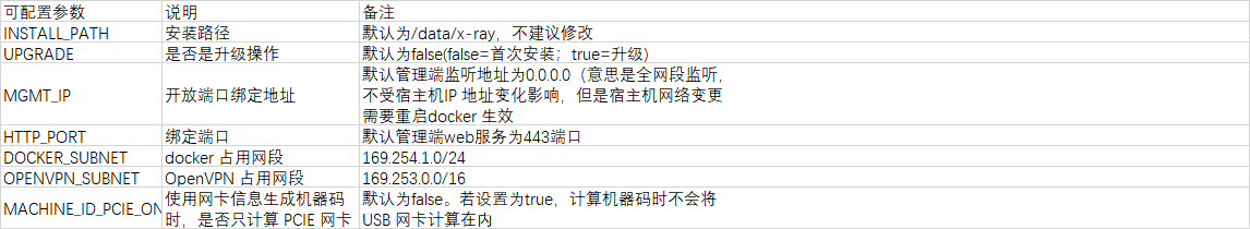 如需要出现需要修改部署管理目录、部署网段与客户内网占用网段冲突、Web 服务端口需要修改等,可以在安装时增加对应参数来进行修改: