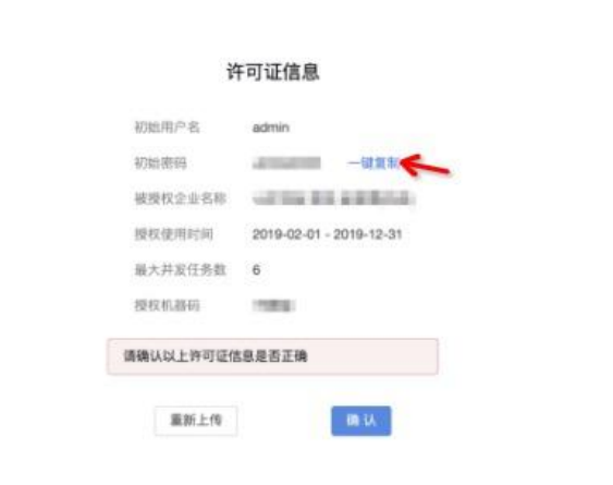 3.将申请到的许可证上传,出现如下显示。请务必复制此处显示的用户名、密码。并妥善留存。确认已留存用户名密码后点击确认