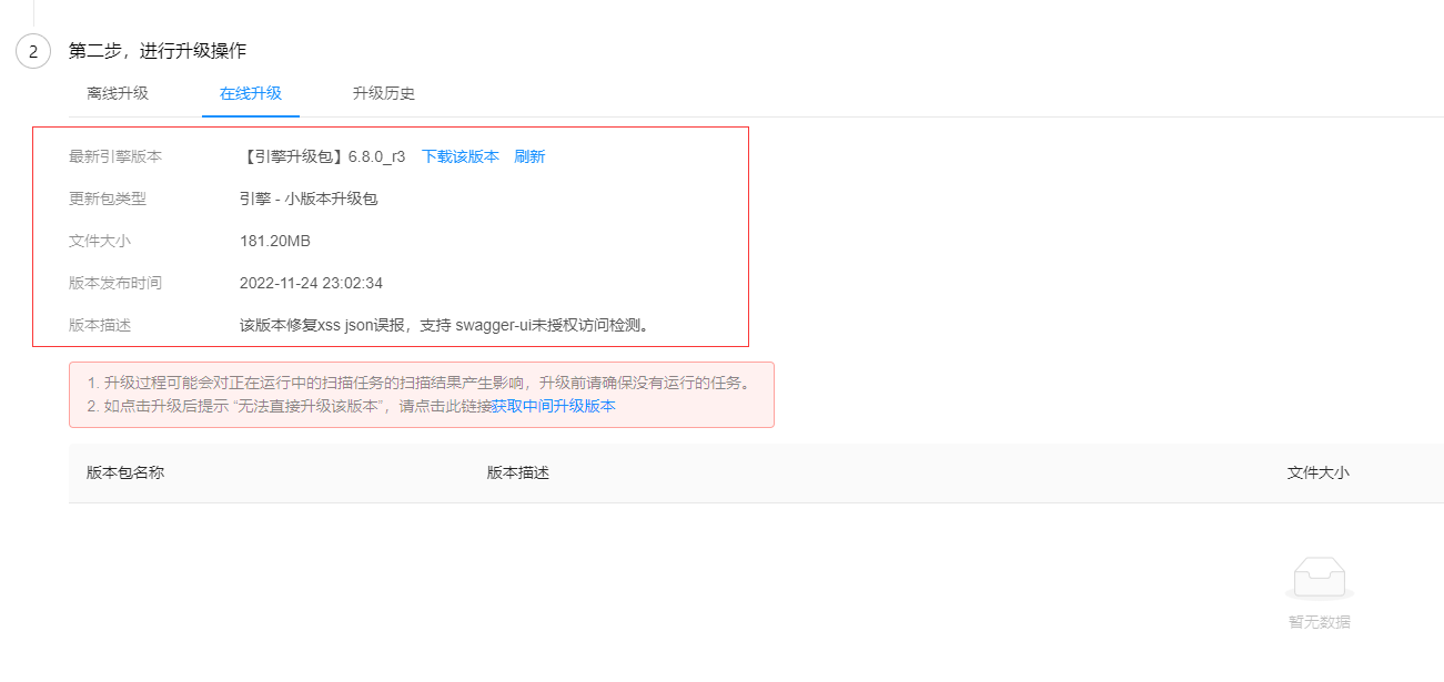配置完成后,再次访问设备的在线升级,报错内容会发生变化, 提示您需要到相关网站进行产品注册: