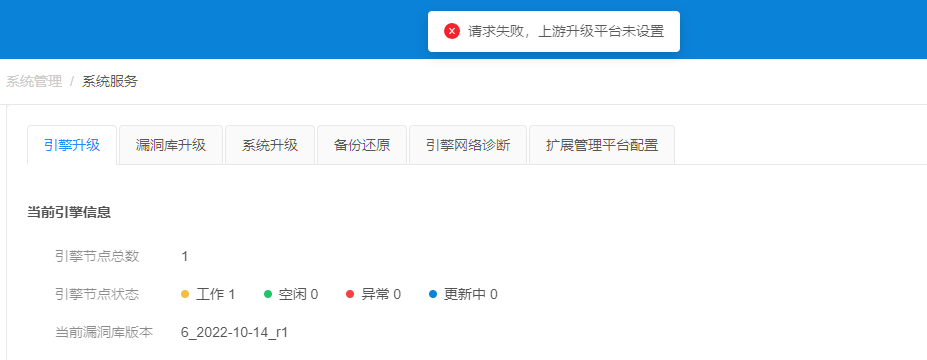 若产品出现“请求失败,上游升级平台未设置”,则需要在洞鉴后台进行相关配置