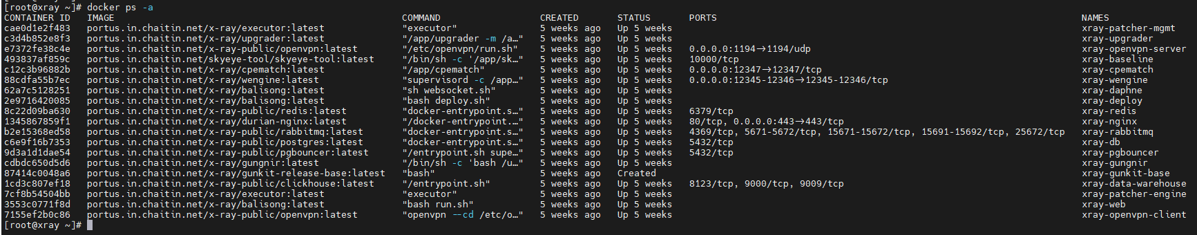 设备正常运行后,容器状态应为如下状态(以单机部署为例 管理节点和引擎节点装在同一台设备上)