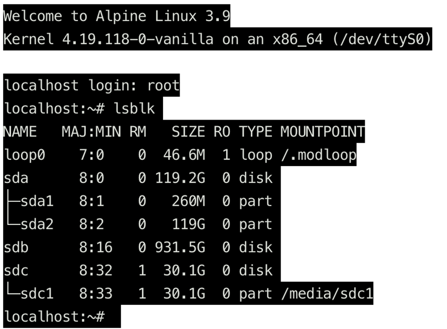 3.执行 lsblk 命令列出存储设备,注意区分 U 盘和机器内的硬盘: