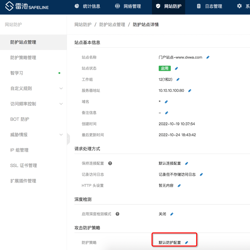点击“网站防护”>“防护站点管理”, 编辑站点,比如将防护策略 改为 默认防护策略。