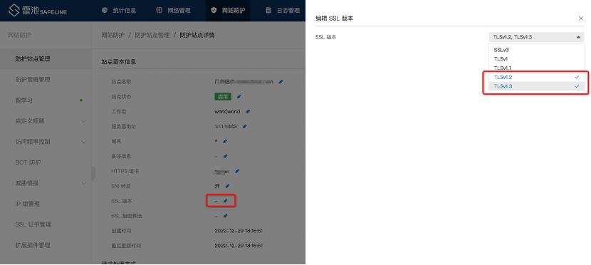 上面完成创建站点后,建议根据客户业务原本实际对外提供的SSL/TLS协议支持情况进行配置,编辑该站点,选择“基本信息”>"SSL版本"进行配置。同时 SSL加密算法 一般不用进行配置,仅当一些特殊情况需要进行配置。比如:当通过安全评估工具(如:漏洞扫描器、https://myssl.com)检测站点使用了不安全红色加密算法时,根据客户需求,进行算法配置的调整。(可联系长亭技术支持咨询相关配置方法)