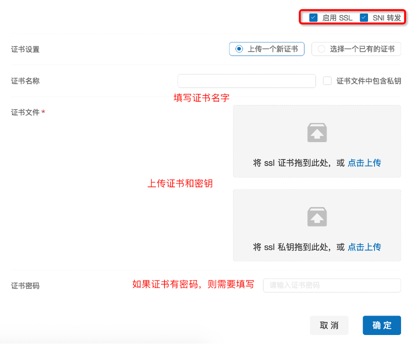 2、如果站点是https站点,则需要勾选“启用SSL”,同时勾选“SNI转发”