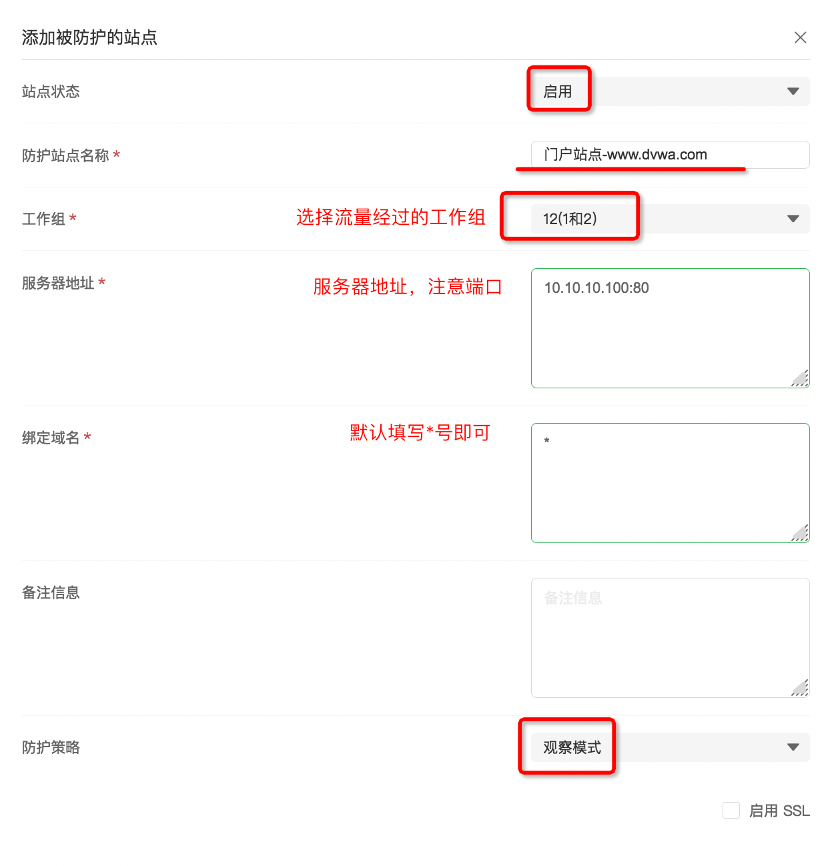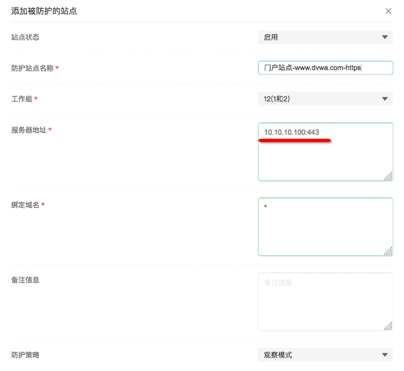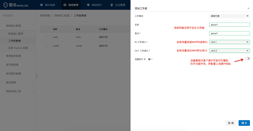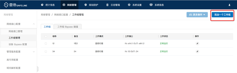 注意:工作组接口选择,透明代理模式工作区分流量方向,IN工作接口是请求流量进入的地方,OUT口是流量出去的接口,牢记1进2出,3进4出的习惯,如果流量接反了,会导致WAF无法检测流量,但可以正常转发。