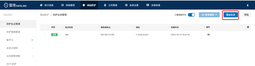 1、添加客户指定站点,点击“网站防护”>“防护站点管理”, 点击右上角添加站点,如下填写后,点击确定,创建站点成功。