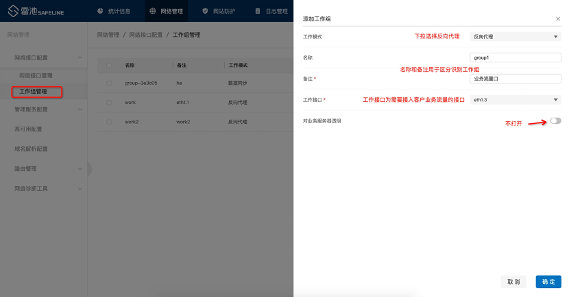 点击“网络管理”>“工作组管理”, 点击右上角添加工作组,按如下要求填写后,点击确定,创建工作组成功。