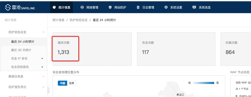 2、登录web界面查看统计信息界面,查看请求数是否发生变化(当WAF正常检测到HTTP流量时,请求数会开始增加)