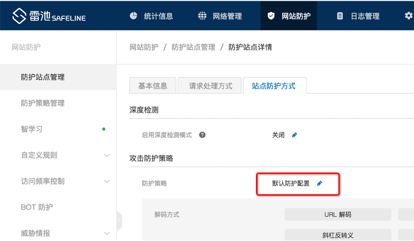 点击“网站防护”>“防护站点管理”, 编辑站点,将防护策略 改为 默认防护策略。