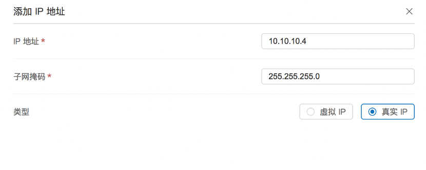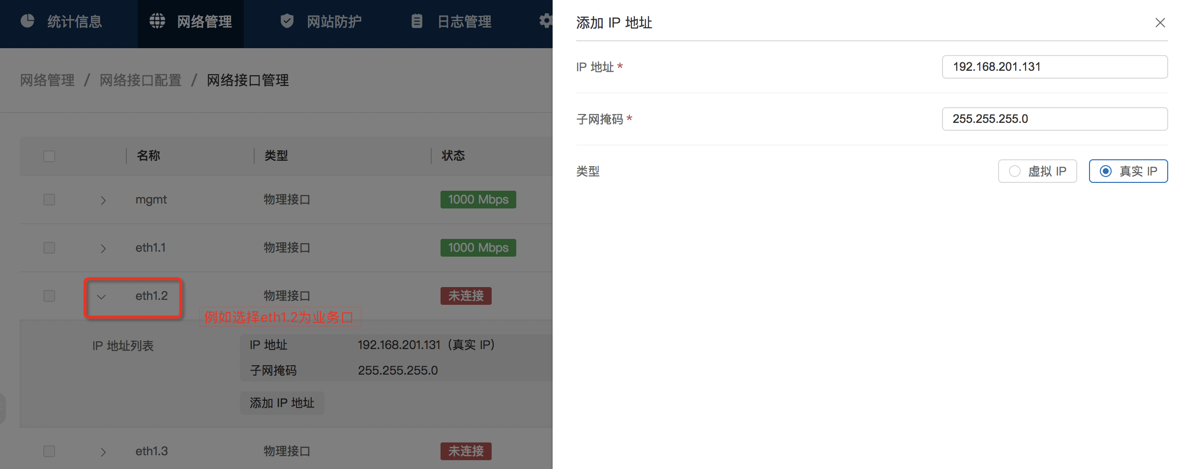 2、业务口配置业务流量转发使用的IP,单机部署情况下,添加类型是真实IP,如需要部署双机HA,则通常需要配置一个类型为虚拟IP的业务IP,可查阅 雷池硬件版-双机HA配置说明 相关文章,或者咨询长亭技术支持。