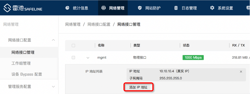1、管理网口MGT口配置设备管理IP,注意添加类型是真实IP