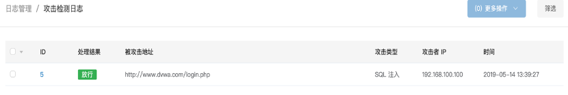 3、通过模拟攻击,确认攻击是否正常产生日志: http://www.dvwa.com/login.php?id=1 or 1=1 ,上面我们配置了观察模式,所以此处是放行。