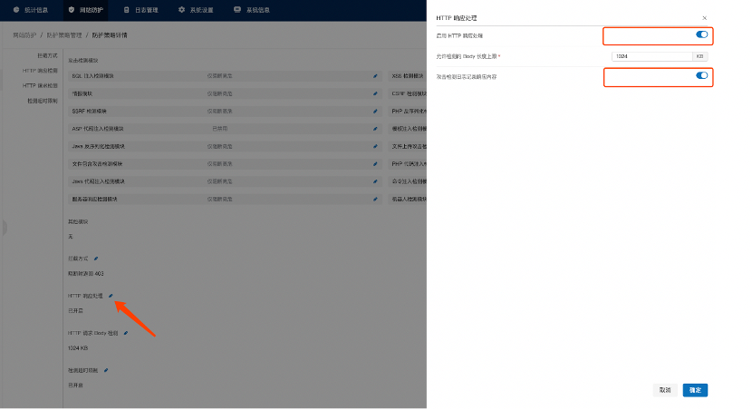 同时检查确认开启了“HTTP响应处理”,并开启了攻击检测日志记录响应内容(如有)。