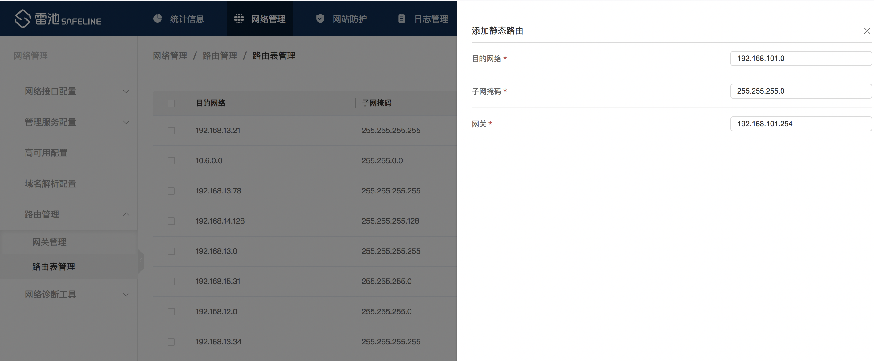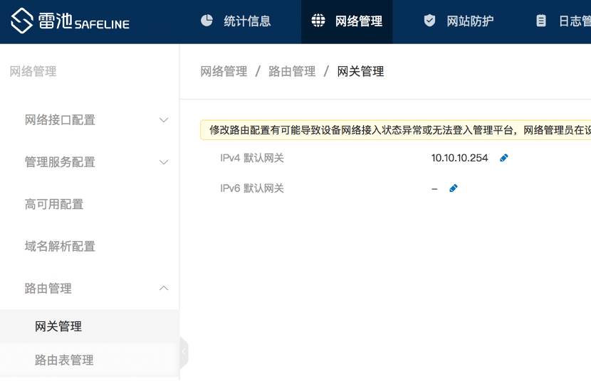 3、路由管理配置网关,硬件版雷池WAF目前仅支持配置1个IPv4/IPv6默认网关,因此当出现WAF与 客户设备管理员网段、业务网段 需要走不同网关时,需要额外配置静态路由。
