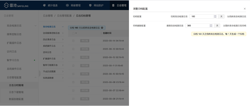 2、日志归档配置,可根据实际需求合理调整自动归档时间周期、自动删除归档周期。
