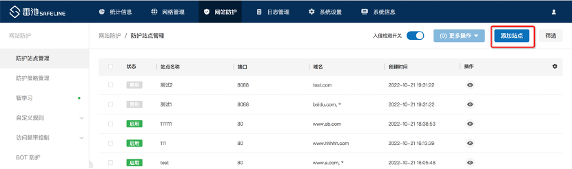 1、添加客户指定站点,点击“网站防护”>“防护站点管理”, 点击右上角添加站点,如下填写后,点击确定,创建站点成功。