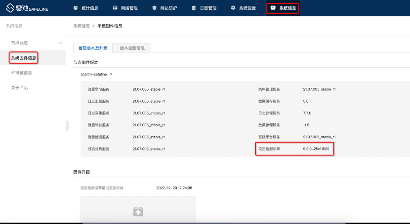 查看“系统信息”> "系统固件信息",点击节点固件版本,确认当前各系统服务版本号、攻击检测引擎版本号,可联系长亭技术支持确认是否有系统更新补丁、检测引擎更新版本,如有更新版本,可直接在下方“固件升级”处上传更新。