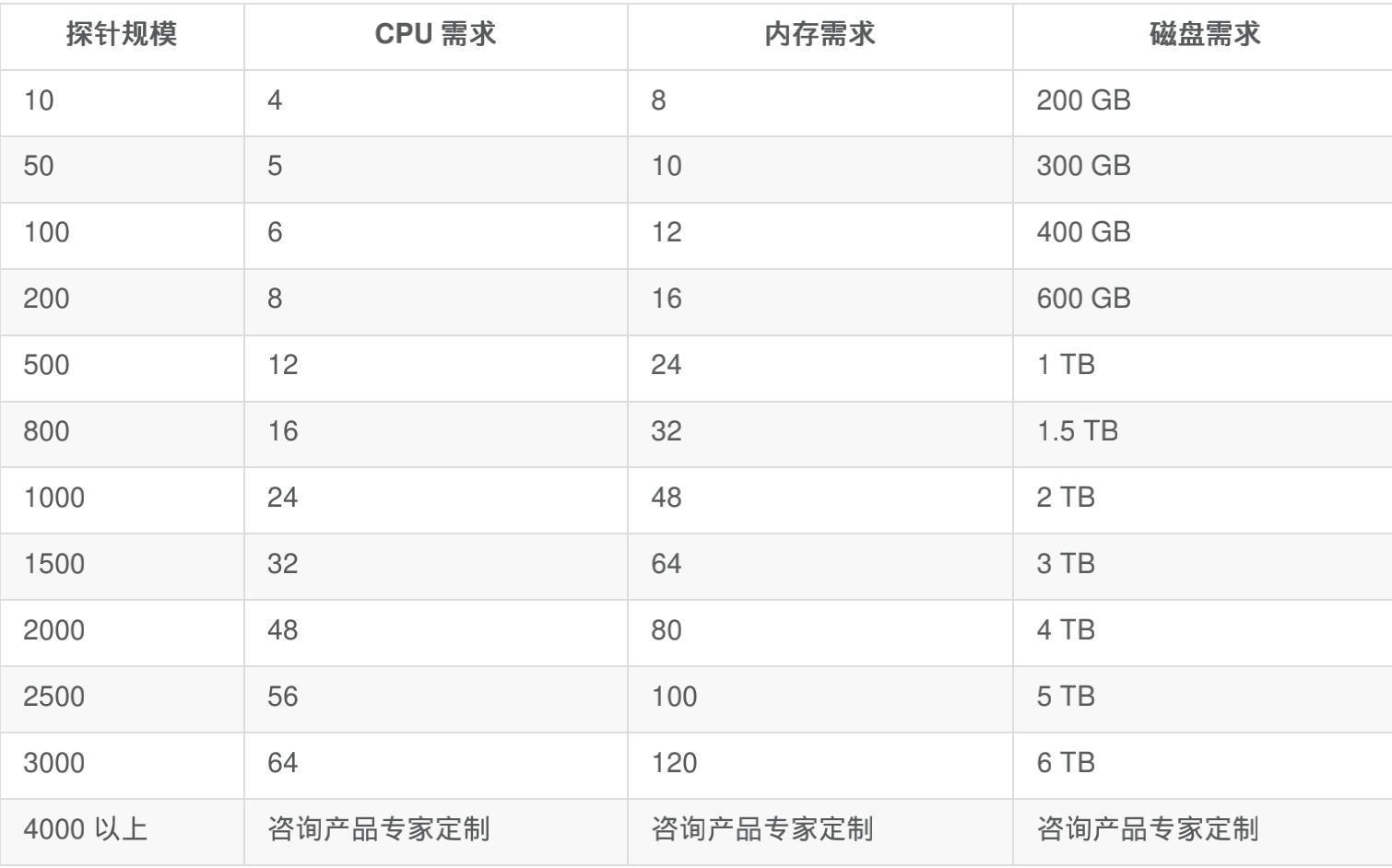 在最小化部署的环境之上,每 100 个探针需要额外增加以下资源: