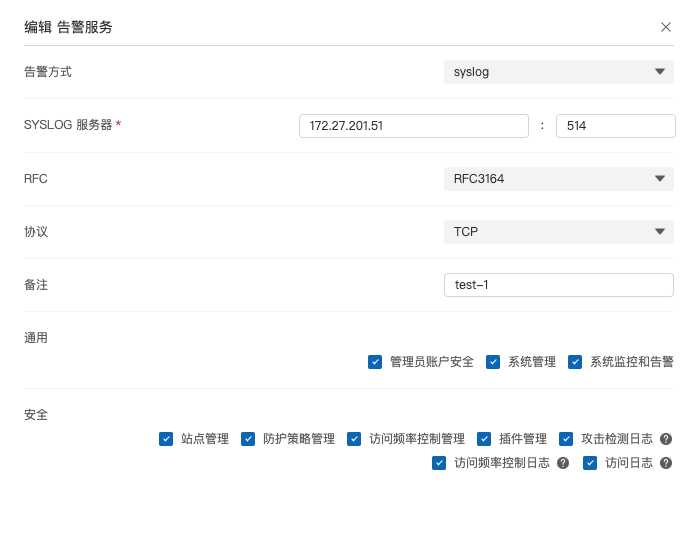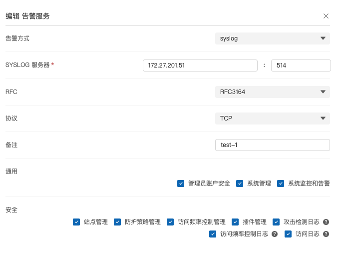安全,主要为策略日志和域名管理记录,比如编辑站点或策略都可记录系统日志,而这可选择使用syslog投递或者email告警。访问、攻击以及频率日志只支持syslog投递。