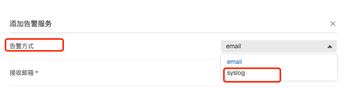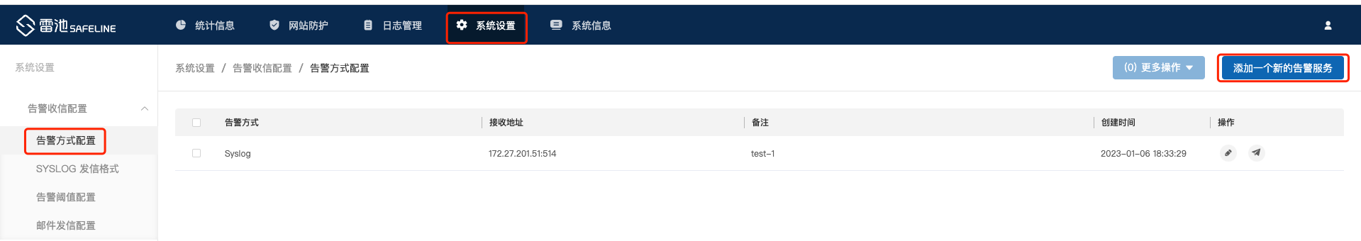 系统设置->告警收信配置->告警配置方式配置->添加一个新的告警服务->告警方式选择syslog;