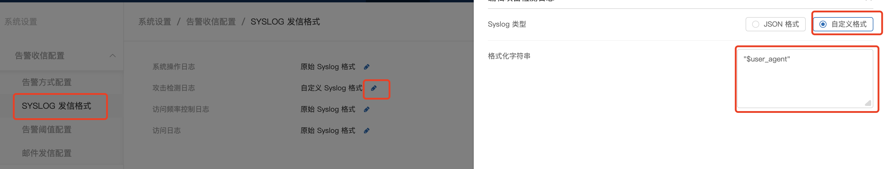 在自定义格式的格式化字符串中,以美元符()开头的单词代表一个字段,在 Syslog 发送的时候会被检测日志中对应的字段替换。假设请求的源 IP 是 127.0.0.1,src_ip 会被替换 127.0.0.1。若希望对应的字段被替换时其包含的特殊字符串(控制字符 \r \n、不可见字符、引号)被转义,可以使用双引号将其包裹,即 "src_ip" 会被替换为 "127.0.0.1"。如果希望在格式化字符串中使用美元符,可以使用两个美元符 :即 src_ip 不会被认为是字段,而会直接输出为 src_ip。