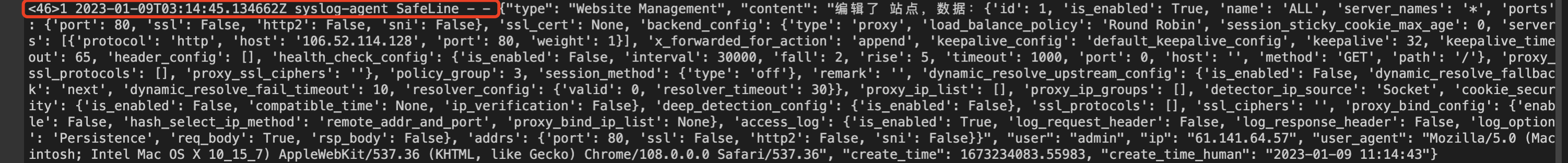 syslog 默认投递都是json,在投递的日志中有syslog消息头,在此之后便是完整消息内容。